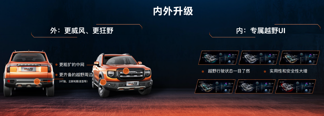 内饰也暗含小心机、高级感更胜一筹,中控“旋风纽”从4种地形模式增加到6种,中控大屏还增加了专为2.0T四驱版车型量身定制的越野UI,可显示海拔、气压、车身倾斜角度、轮间扭矩输出状态,车辆行驶状态一目了然。星河环绕、内有乾坤,那感觉立刻就来了。